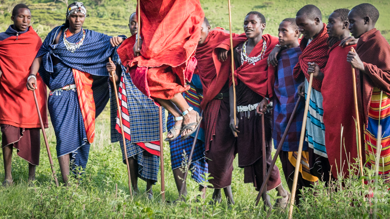 Masai warriors demonstrate their strength and skill with their jumping dance, or adumu. Straight, narrow, and immobile, apart from their feet and legs, is key to this competitive dance. The height and style of the jump is the way to show their warrior strength and, of course, attract the women. They take it in turns to perform, with each man normally only jumping two or three times in sequence.