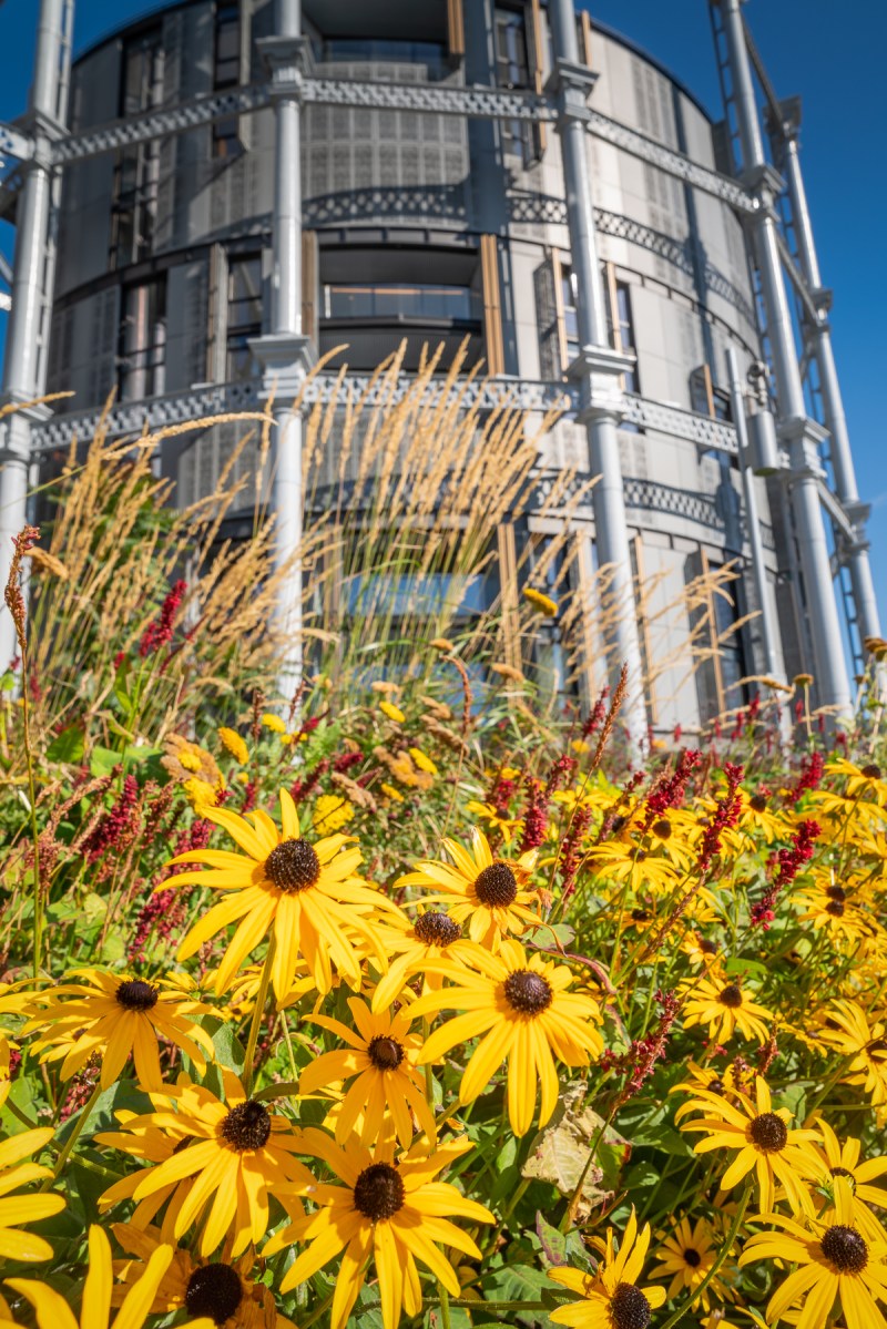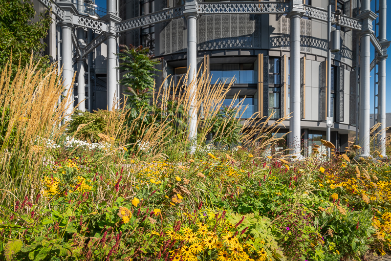 Am amazed at the contrasts in your organized images of the grey-ish colors and steel construction of the buildings with the warmth of the free-floating beauty of these Autumn grasses and flowers! A pleasure to look at! Many thanks for linking this kind of beauty to All Seasons! Have a joyful week:)