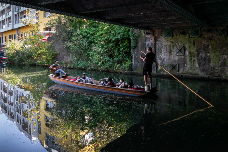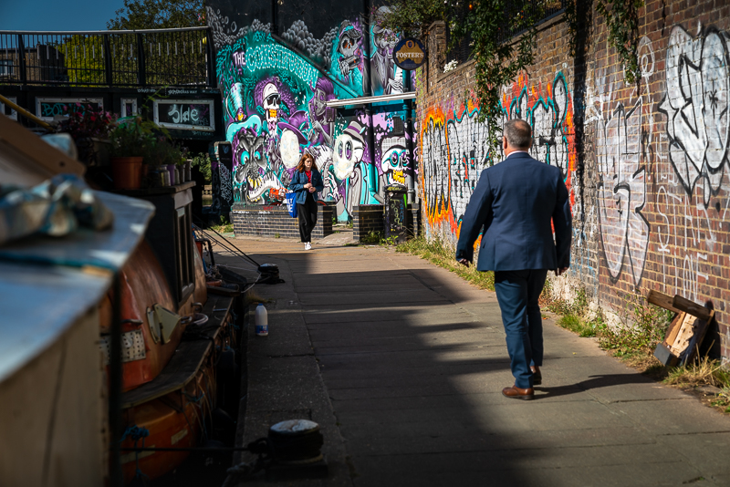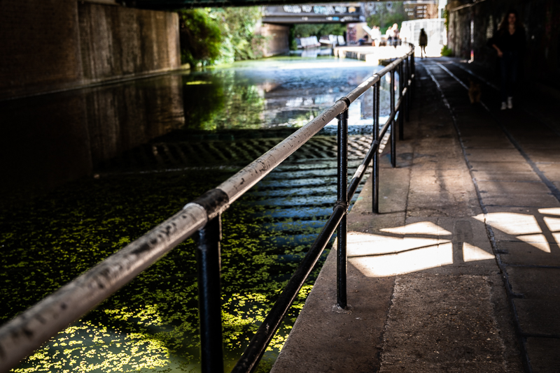 We’ll wander beneath a few bridges, with crazy reflections in the canal, and enjoy the long shadows and the brightness of street art as we wander.