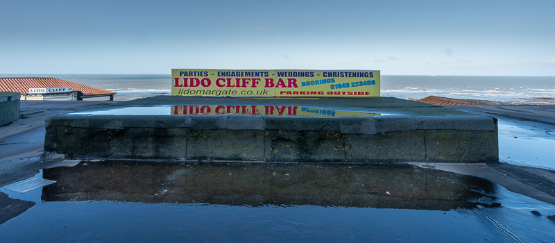 The Lido at Margate was a popular seafront venue from the 1920s, designed by John Henry Iles, the man also responsible for Dreamland. This fairground that been revived in the last few years but, in contrast, the Lido pool was closed in the 1980s and is now filled with sand. The buildings still stand and there are attempts in place to revive the complex. In the meantime, however, I had to rely on puddles for my reflections.