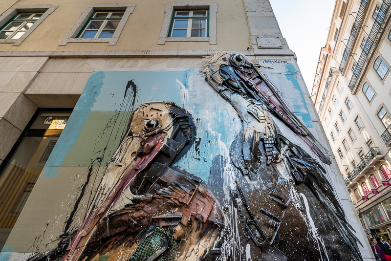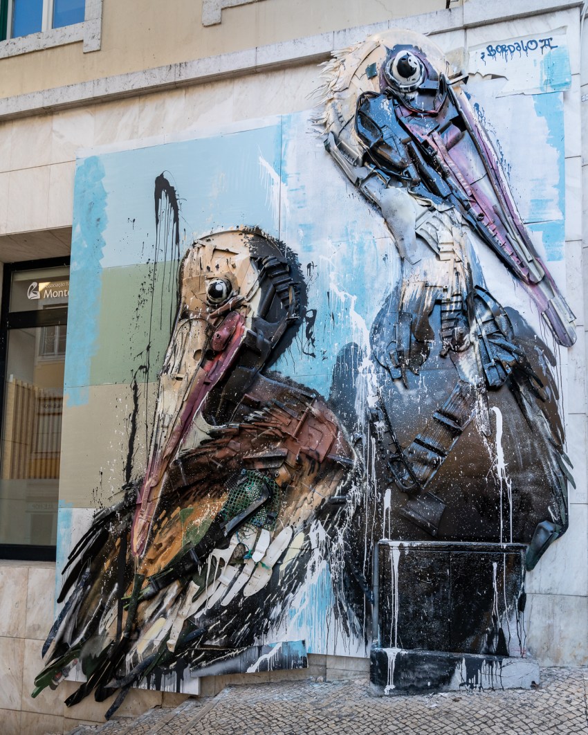 This 3D mural is unmistakably the work of Bordalo II. His striking creations are made of garbage found in the city and he has the skill to turn them into art. These pelicans are a great addition to his ever-growing catalogue, and I think this was only completed about a week before I spotted it.