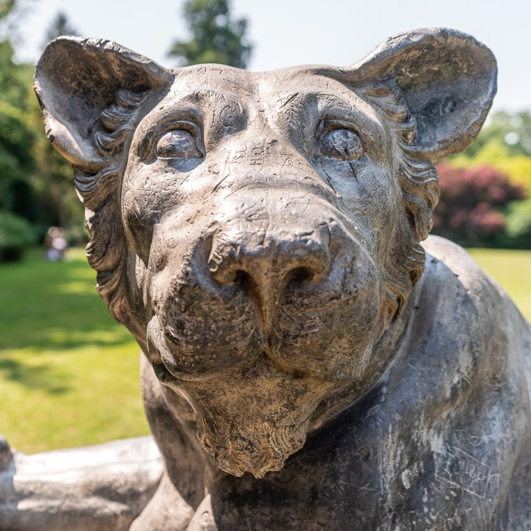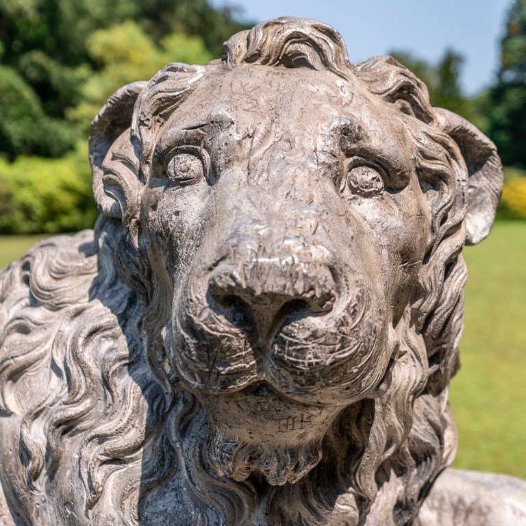These lead lions are early 18th-century statues Dutch sculptor Jan Van Nost the elder. They stand guard at the entrance to a temple that was constructed in the grounds of Anglesey Abbey to mark the coronation of HM Queen Elizabeth in 1953.
