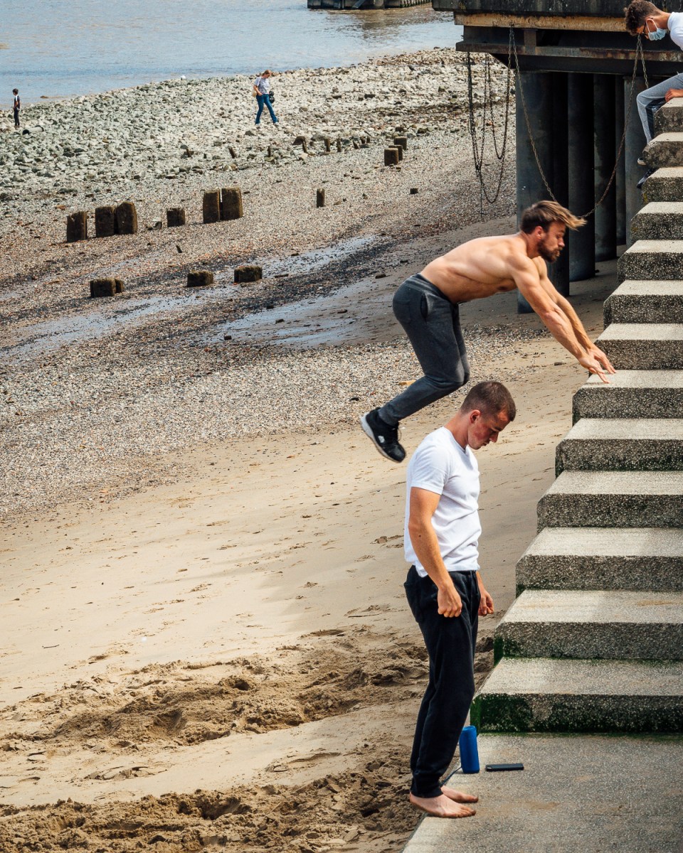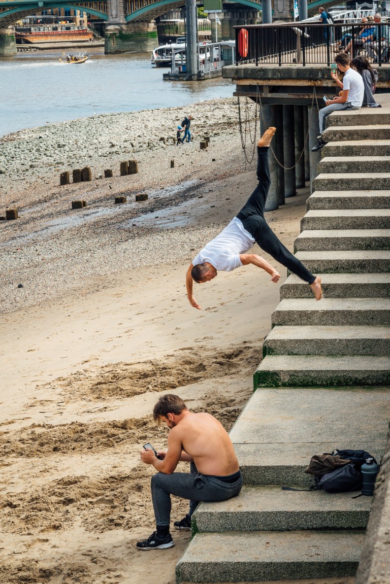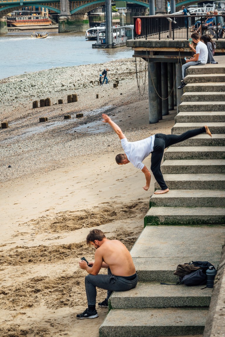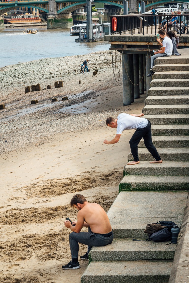 When enjoying the walk along the South Bank of the Thames, it’s always worth peeping over the railings to see what’s happening on the beach. What will it be? Seabirds resting; dogs chasing; children building castles; adults poking and digging for treasure; sometimes even a spot of sunbathing. A couple of weeks ago I found two guys practicing their leaps and turns from the steps. I’ll let you join in the fun with three slideshows below (they may take a while to load).