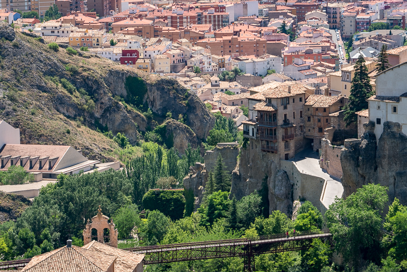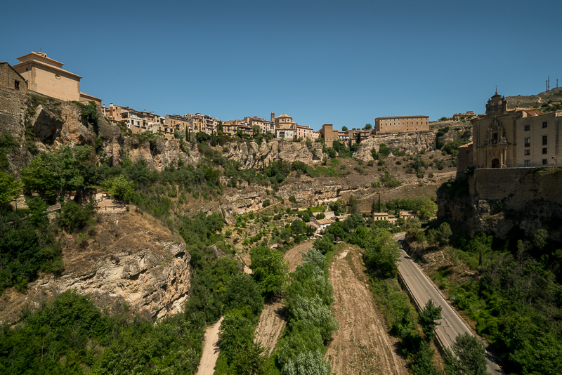 If we clamber to the top of the old town, we can get our bearings. To one side we can see the Rio Huécar, embellished by summer greenery and with the old town on the left.