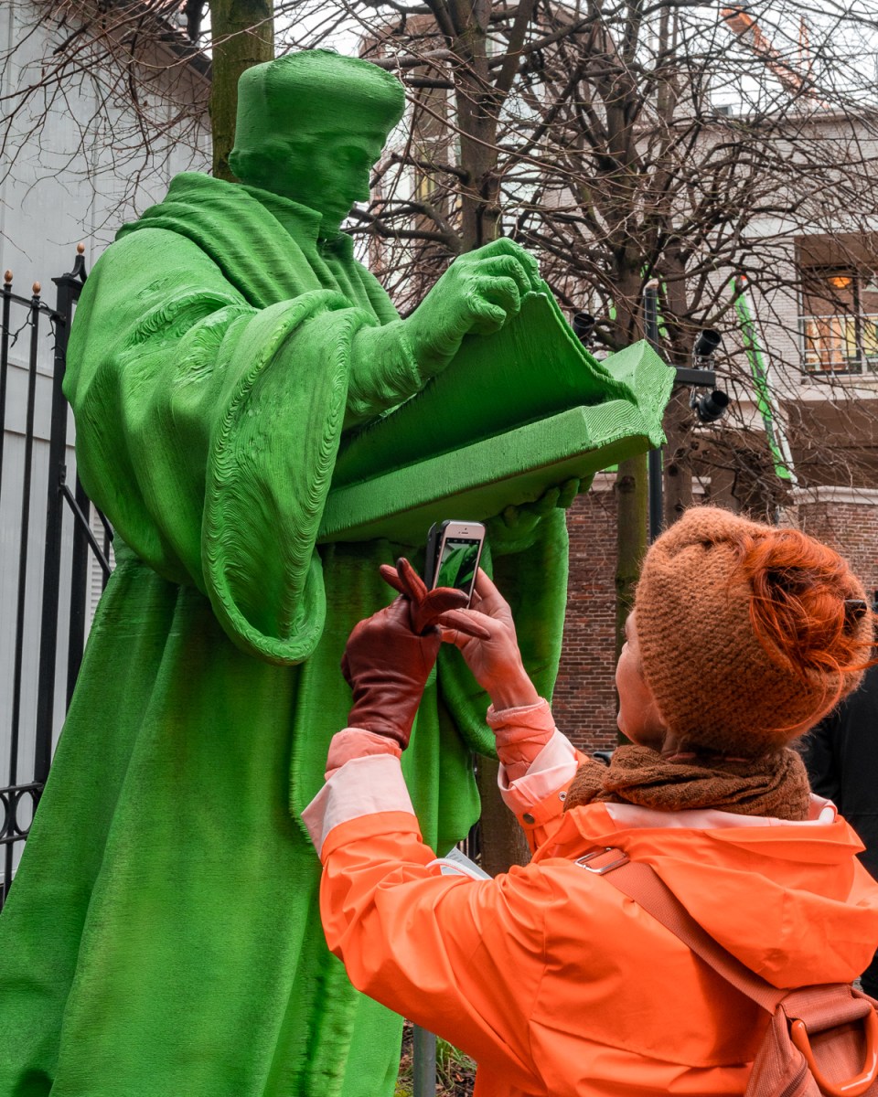 This green Erasmus is a faithful copy of the bronze statue of Desiderius Erasmus by Dutch sculptor Hendrick de Keyser, that first stood in the Grote Markt in 1622.