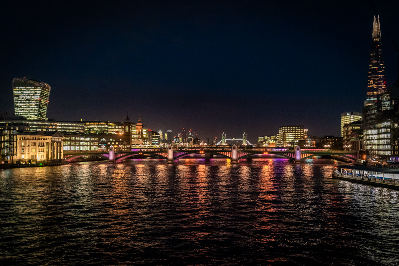 Nighttime pedestrians under and on the Millennium Bridge, London, January 2020