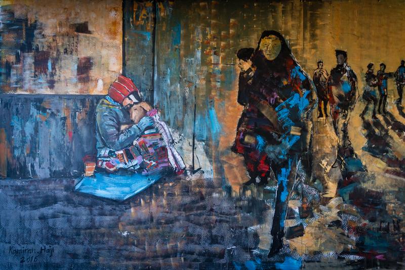 I felt a mixed message in this mural. The plight of the homeless looking for shelter are shown in darkness, almost impressionistic inspired, while the little boy in the box on the right is in full light, seemingly has much going for him, and appears to be able to look past the hardships he “presumably” must endure.