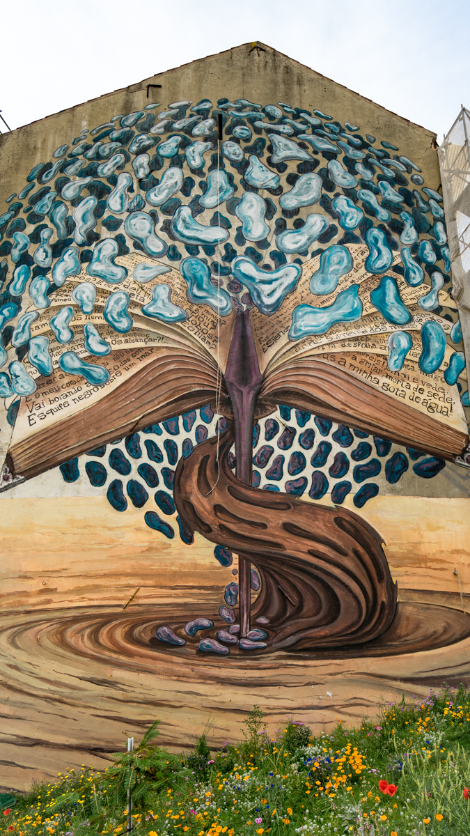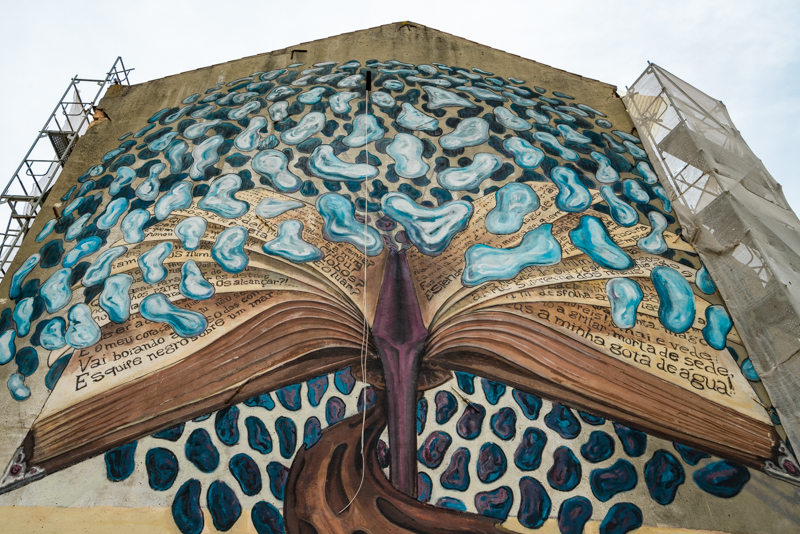 This wordy and watery tree is the work of Portuguese street artist João Maurício, aka Violant. It was painted as part of the 2014 Passeio Literário da Graça project that celebrates the works of a number of Portuguese women writers.