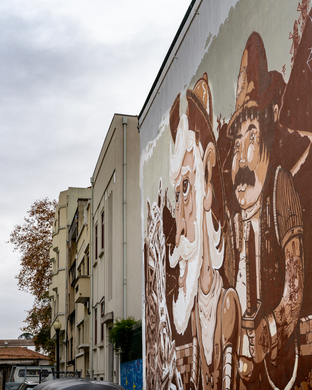 This mural was created in 2014 as a collaboration by Porto street artists Mots, Mesk and Fedor. I believe it was the first legal street art in Porto.