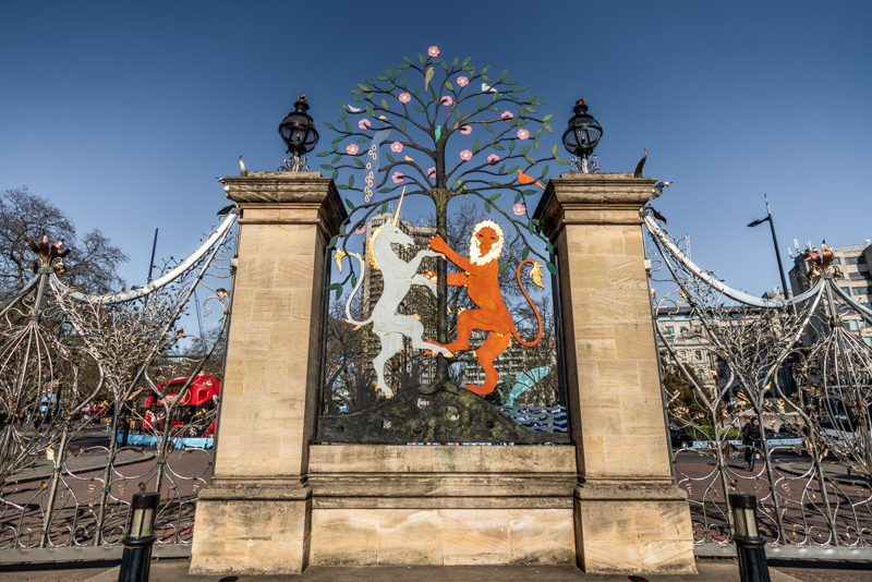 Here, we are greeted by two national symbols: the lion of England and the unicorn of Scotland. The central portion was designed by David Wynne and the sparkling stainless steel gates are the work of Giuseppe Lund.