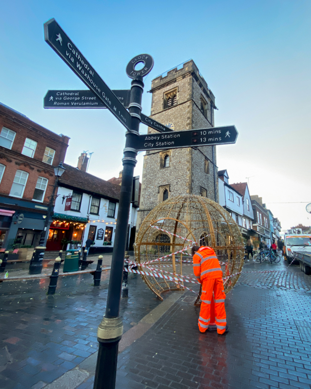 Christmas decorations arrive in St Albans, Hertfordshire, November 2023