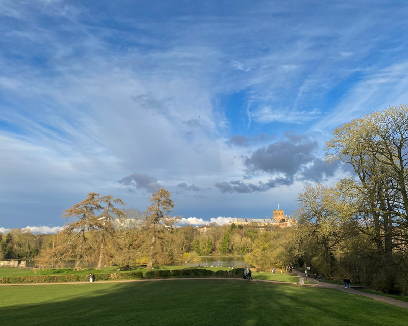 View across Verulamium Park towards St Albans Cathedral, Hertfordshire, March 2024
