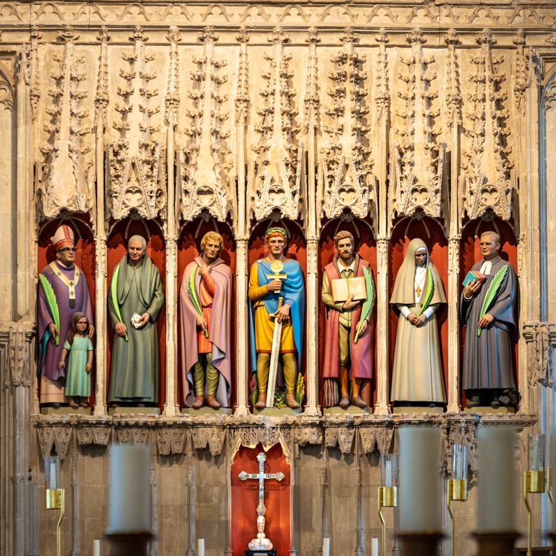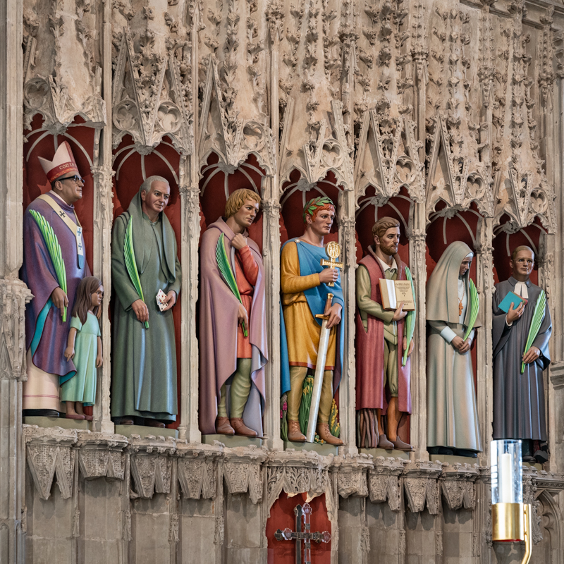 The seven statues of martyrs were installed in the previously empty niches of the nave screen in St Albans Abbey in 2015 to commemorate the cathedral’s 900th anniversary. They are the work of sculptor Rory Young.