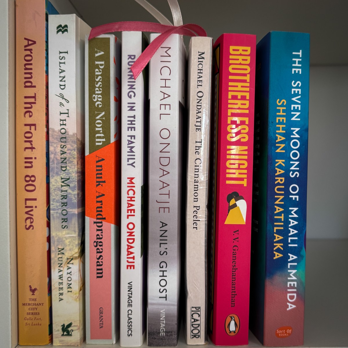 • I love Ondaatje’s writing – very poetic. I watched English Patient, but it’s not the right country. I highly recommend Running in the Family – beautifully written, with sense of humour, and reveals much about his life and his home country. I loved Brotherless Night and Cinnamon Gardens too. And Seven Moons is going with me.