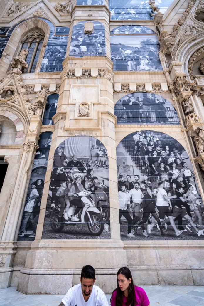 Local people come together in the collage work of JR on the facade of Naples’ Duomo, Italy, May 2025