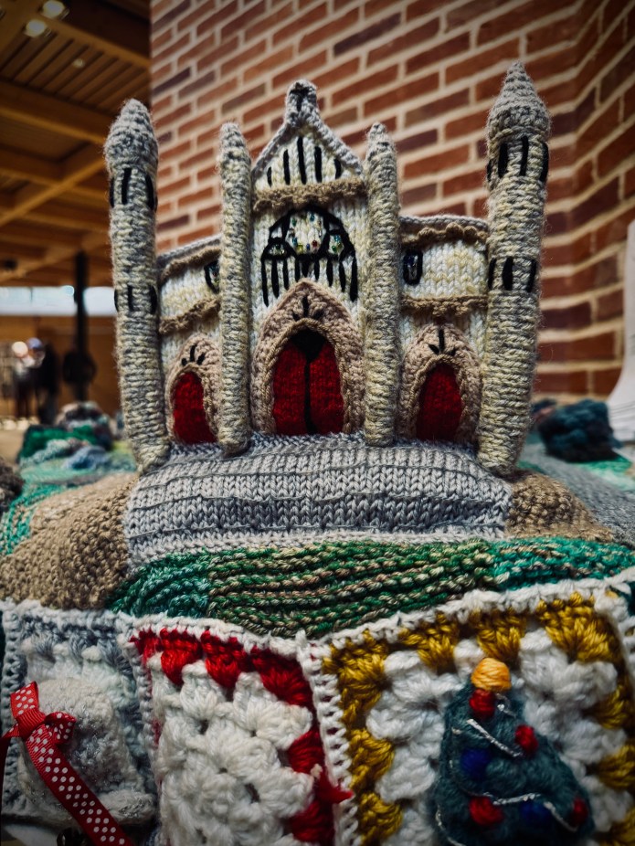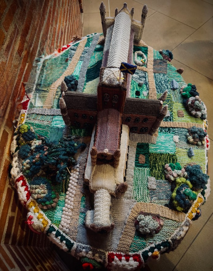 To scale knitted version of St Albans Abbey, made by Sopwell Knitters in 2022
